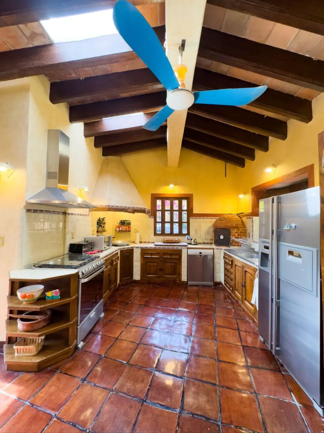 *amplia cocina rústica equipada, que incluye horno para pizzas, barra y alacena.